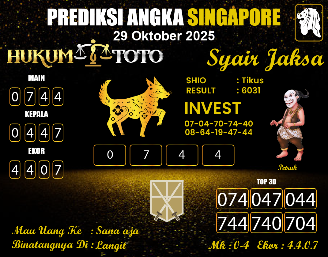 Mencari angka jitu keluaran singapore di Prediksi HukumToto terus-menerus selalu dapat membantu banyak bettor. Lantaran, bukan cuma siapkan result togel dan prediksi togel yang komplet dari beberapa pasaran, di Prediksi HukumToto pula kalian dapat mendatangkan atau menganalisis buku mimpi togel, di mana semasing tipe mimpi yang pas abjad diartikan pada tipe angka. Baik itu buku mimpi 2D, 3D hingga sampai 4D.